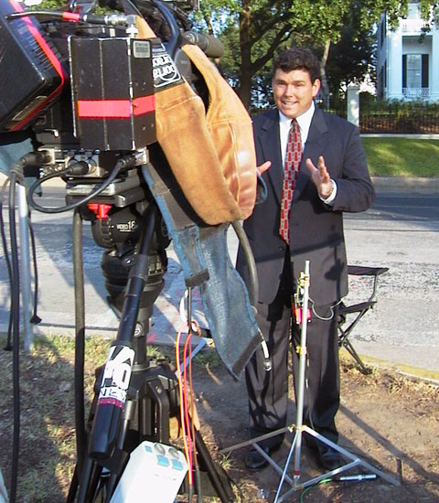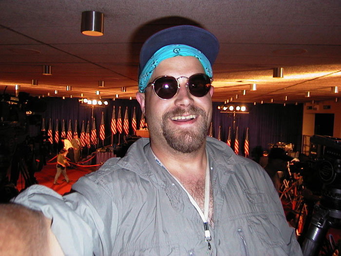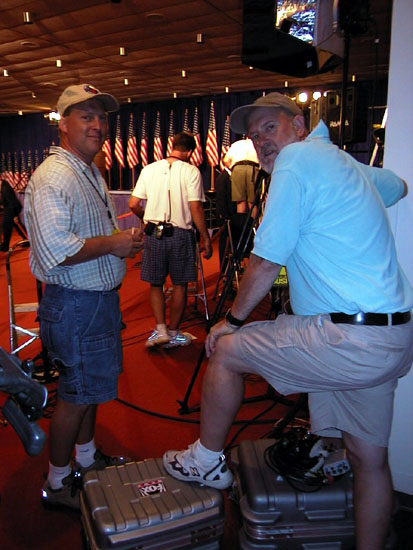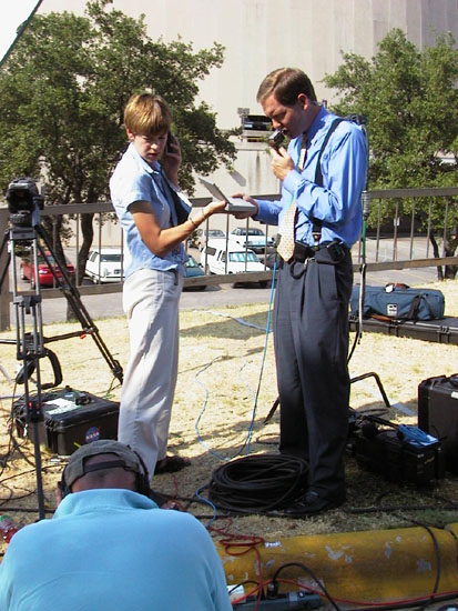 Anyhow, While I was relaxing with a friend in Charlottesville, the finishing touches were being put on the workspace and the convention floor. The rent-a-cop security that I walked out through on Monday was now replaced by Secret Service checkpoints. I now have eight different credentials, half of which I don't even know what they're for. The other big change is that the infantry has started to arrive. There must be close to 100 people now here on site for Fox. Here is an interesting factoid I heard today - for every floor delegate to the convention, there are 16 members of the press. It almost makes one wonder how much of a political event this really is, or is it just a media love fest? More pictures now from Austin. I'll have new Philly pix tonight! Philly GOP2000 coverage continues on Page Four. July 26, 2000 - Dateline Austin, Texas. A crazy interlude from the convention. I was flown out here at the very last minute to take care of a bunch of problems with a vendor truck, and get out coverage of Bush's VP announcement on the air. Too bad it turned into another 40 hour day! By the time New York made the decision to fly me out, it was too late to fly to Austin. So I flew from Philly to Atlanta to Houston, rented a car, and started driving. Keep in mind that my day started at 0700 in Philly with our first liveshots from there. By the time I got into Austin, it was 0330 and time to start working. With a lot of effort and improvising, I got us on the air and we didn't miss a single live shot all day. It wasn't pretty, it wasn't the greatest stuff I've ever done, but we made the show and that's all that count. Welcome to the campaign. Welcome to guerrilla television. I'm off to DC now for a few days off before the convention starts. I was supposed to be changing planes in Chicago right now, but I totally slept though my early flight this morning. I guess that after 36 hours of being awake, my mind still thinks I'm superman but my body has other ideas. I must have been dead to the world, because I never heard my wakeup call, or my pager going off three times. Good thing I don't need to be making TV today! |