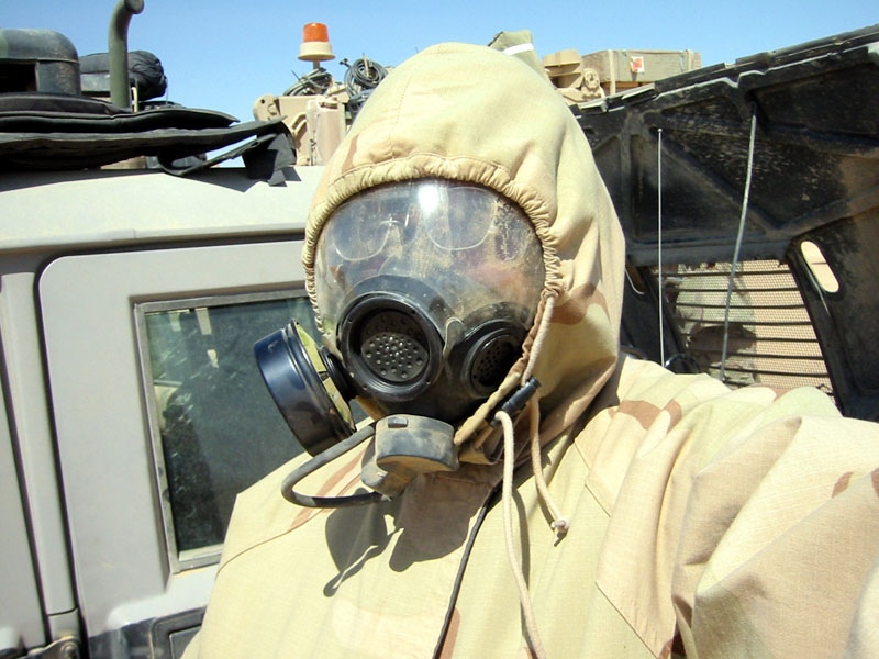 Ben models the latest in military MOPP fashion |