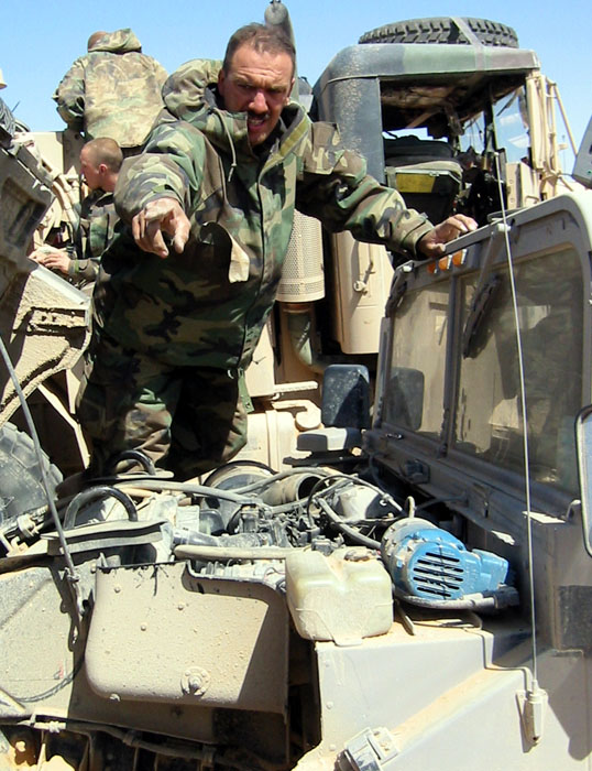 The mechanics working on the hummer in their MOPP gear |