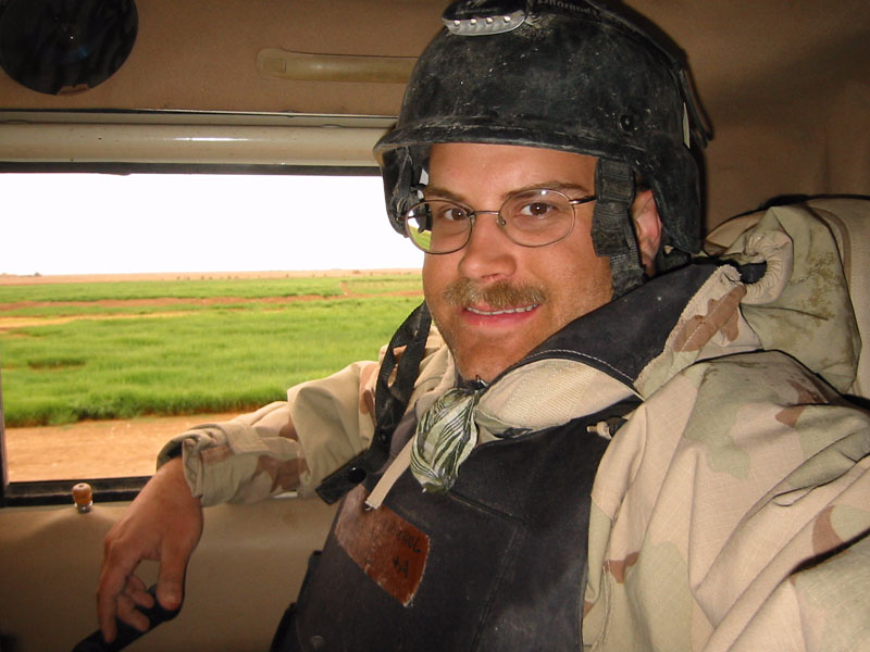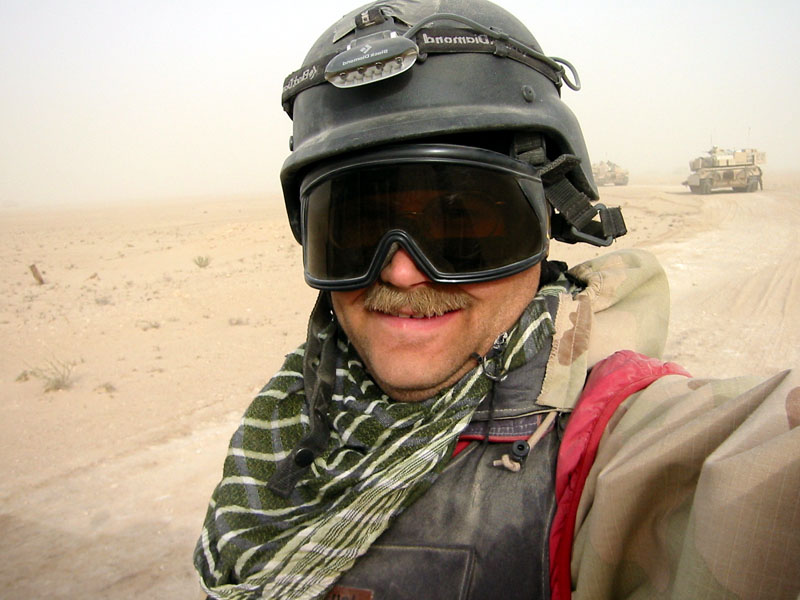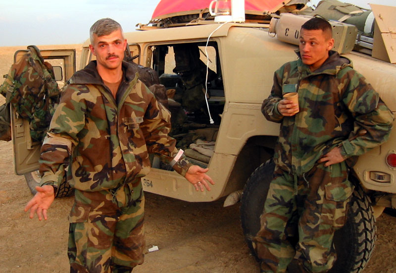 So I am driving, in the dark, in Iraq, off road, 90 ton tanks on all my sides. I'm wearing my chemical suit, made up of a heavy jacket and trousers. I have my helmet and flak vest on as well. And I'm trying to get into my fly and, shall we say, connect the nozzle to the bottle. Things wound up working them selves out just fine, and I left a little present for the Iraqi people somewhere in the desert.