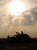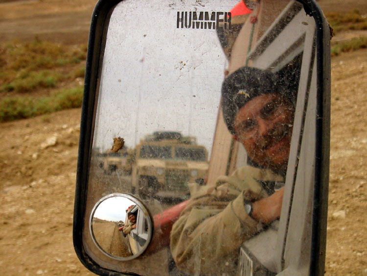 Mal takes off in the morning with Perkins. Greg and I are waiting in the rear with the car, hooked up to another hummer and waiting for the convoy to move. It is a breezy day, but the morning sun is warming us up after a night sleeping in the open. I'm napping in the car when I hear an explosion crack out to my left. I'm instantly awake. Another crack and Greg and I are out of the car looking for cover. Everybody is running for their vehicles. We are under mortar attack, and the SOP is to high-tail it out of here. We quickly pull out and roll down the road a few clicks. We pull off the road and all the troops assume defensive positions. Greg and I don't know exactly what is going on, but we seem to be safe for now.