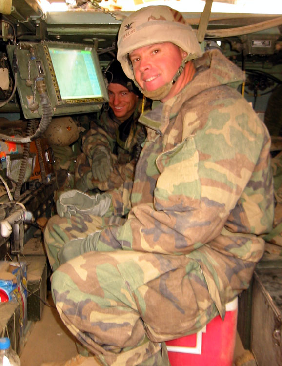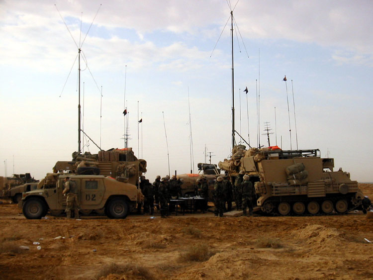 The artillery barrage now over, we move to the command tracks. Waiting now with the commander of 2nd brigade, Col. David Perkins. From here Perkins is monitoring the movements of his troops, deciding if his battlefied is prepared so that it is "Conducive to Iraqi defeat."
