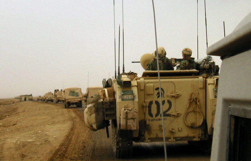 The convoy is really moving along now. We are extremely deep inside Iraq. The morning rain has doused the ground, keeping the dust at a minimum. The overcast sky gives us a very cool day, almost to the point that our chemical suits are comfortable.