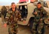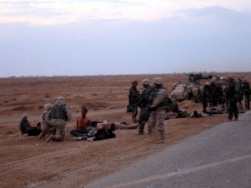An EPW is an Enemy Prisoner of War. All of the prisioners we have heard about so far were down in the south, and they were soldiers who had surrendered or capitulated. These men were captured while fighting. We get over to the fuel point, and top of our tanks quick. Then we search out the EPWs. We find them in the back of a deuce and a half. The look healthy, well fed, clean. The army has given them blankets and some MREs, but their hands are bound. We video them, carefully following the guidelines for EPWs laid out by the military. We cannot interview them, we cannot show their faces or otherwise identify them by person or unit. We set up the videophone on a wide shot, and give live pictures and commentary of the scene. They will not be the only ones we will see today.