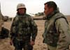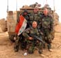 A ways on, we see a Blackhawk helicopter coming in for a landing just off of our route. Three figures jump out and jog towards us. Perkins stops his APC and jumps down to meet them. It is Maj. General Blount, commander of 3ID, making a swing through the field and checking up on his troops and their progress. With him is an aide and Ted Koppel. Yup, the "NightLine" guy. I knew he was embedded with 3ID, but never thought that he might be traveling around with the commanding general in a helo. I guess status has it perks. Right now, on the ground is the place to be. No other network has the live footage we have of the soldiers invading Iraq.