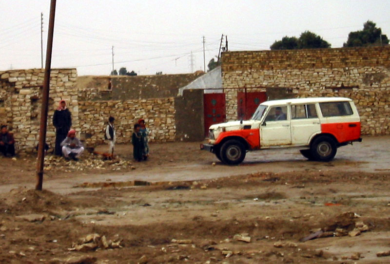 Rolling back to Perkins, we find that he is ready to go. The bridge has been secured, and the convoy is lined up and waiting. We bounce through the desert fields for about 10 more minutes, then come to a hardtop road. It is a most pleasant change from the ride of the last few days.