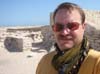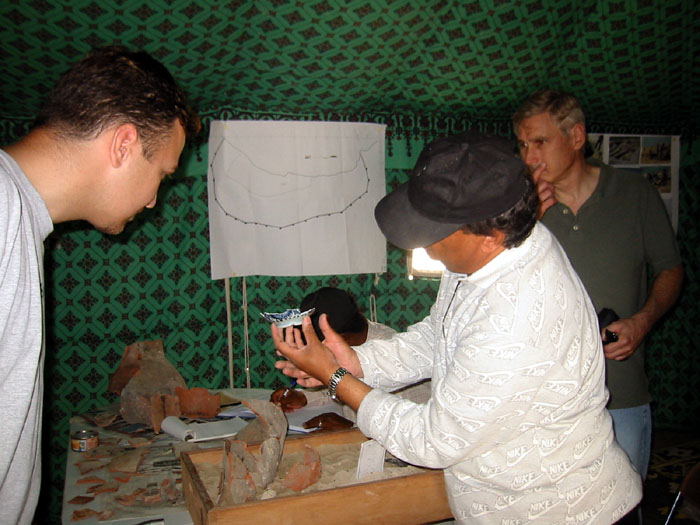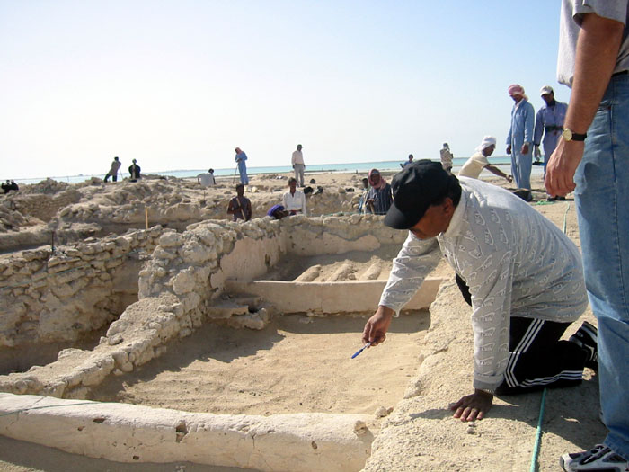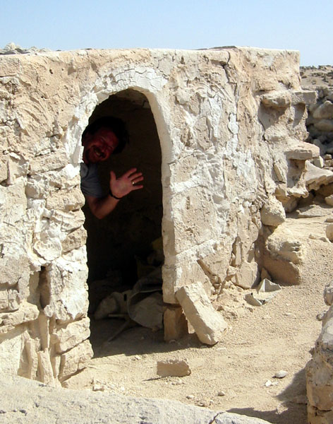 On to the ancient city nearby. We drive a short distance towards a group of tents. This is the old Al Zubara, home once to a city of 15,000 prosperous traders, pearlers, and fishermen. We drive, quite literally, over the city wall to get to the tents. There we meet the director of the dig, who gives us a tour. The city occupied a small peninsula here, just west of the fort. Protected by an encircling wall featuring 21 towers, the city is now crumbled and largely covered by the sand. Houses, stores, stalls, are all now but piles of rocks and stones. What has been excevated is now haphazardly put back together with new stones and cement.